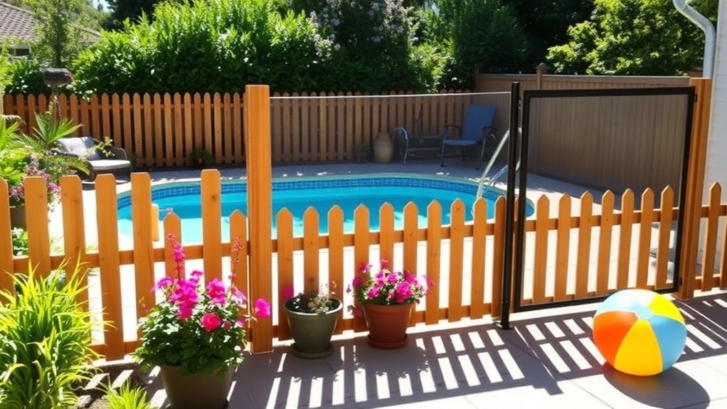 For budget-friendly and safe pool fencing, consider lightweight mesh options that are easy to maintain. Make sure your fence includes important safety features like a self-closing gate and a high latch. Eco-friendly choices made from recycled materials enhance safety while being kind to the environment. You can also customize your fence with colorful mesh or chain link with privacy slats to boost your space’s appeal. Explore more effective solutions and tips for your pool area.