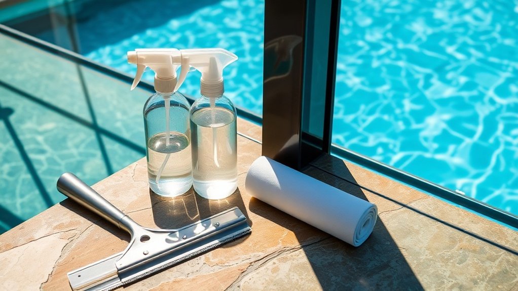 Start with non-abrasive items like microfiber cloths and soft sponges to avoid scratches. Use a garden hose to rinse off loose dirt, then apply a mild dish detergent solution with a window washer. Regular cleaning is essential for maintaining glass integrity, so make sure to clean your pool fence frequently. Finish up with a squeegee for a streak-free shine. Wipe down edges with a lint-free microfiber cloth to prevent water spots.