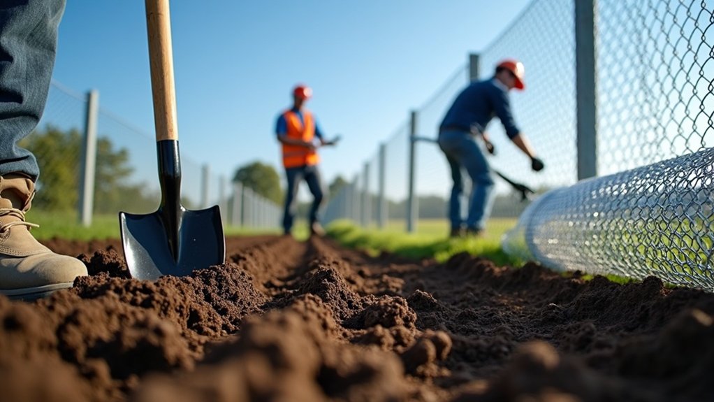 When digging post holes for your chain link fence, stick to the recommended spacing for stability and alignment. Make sure to set terminal posts properly; these are crucial for anchoring the entire fence. Additionally, local codes may dictate the depth and diameter of your post holes, so be sure to check those requirements. A depth of at least 3 feet is recommended for sandy soil in Florida to ensure better stability. Don’t overlook the concrete curing time, as it impacts the longevity of your fence.